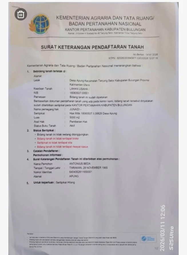 Berdasarkan Surat Keterangan Pendaftaran Tanah Kantor Pertanahan Kabupaten Bulungan Nomor 1417/2026 tanggal 08 Maret 2026, bidang tanah dimaksud tercatat sebagai berikut: